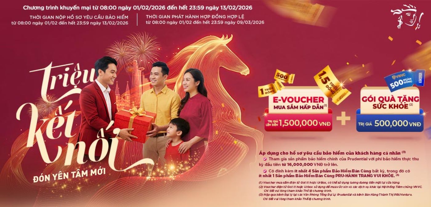 Có Hồ sơ yêu cầu bảo hiểm (HSYCBH) không có cùng người được bảo hiểm chính và được nộp thông qua kênh phân phối Đại lý tại các Văn Phòng Tổng Đại Lý Prudential và kênh Bán Hàng Thành Thị PRUVenture từ 08 giờ 00 phút ngày 01/02/2026 đến hết 23 giờ 59 phút ngày 13/02/2026.